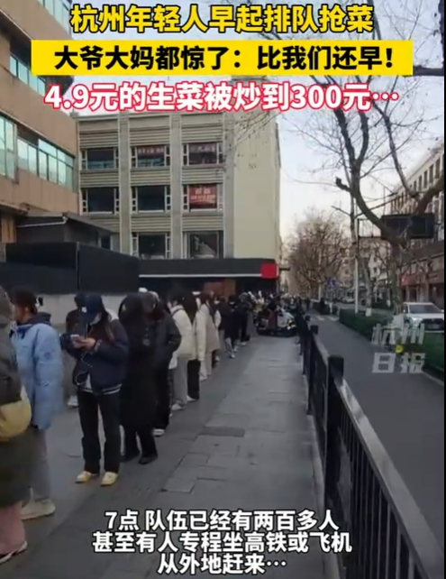 社交平台上,有网友发帖称:不到7点已经两三百人,还有人特地坐高铁来的,年轻人比大伯大妈还早去抢菜。