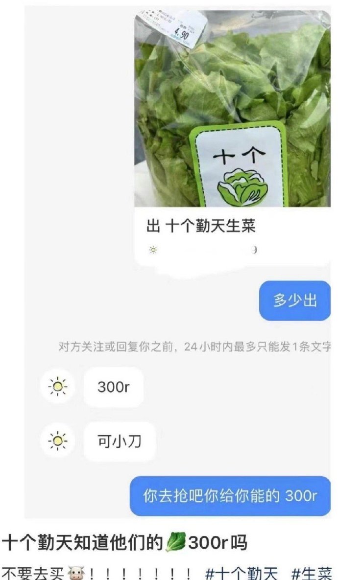 多名粉丝在平台呼吁理性消费,抵制黄牛,并表示,作为粉丝是不会去购买300元一份的生菜,300元是黄牛炒的价格。