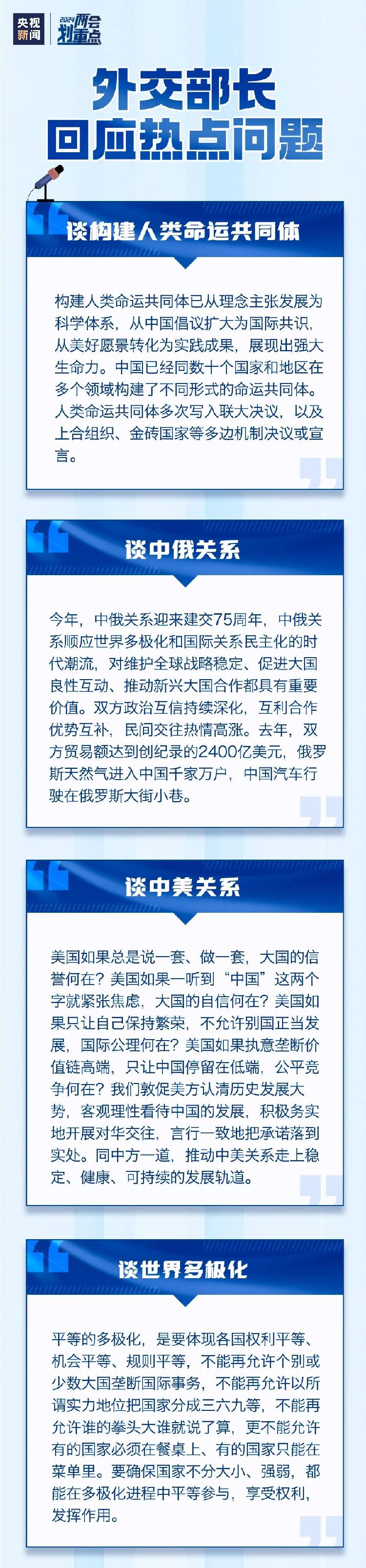 3月7日,中共中央政治局委员、外交部长王毅就“中国外交政策和对外关系”相关问题回答中外记者提问。一张图带你了解!