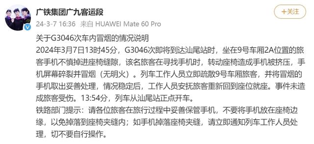 2024年3月7日13时45分,G3046次即将到达汕尾站时,坐在9号车厢2A位置的旅客手机不慎掉进座椅缝隙,该名旅客在寻找手机时,转动座椅造成手机被挤压,手机屏幕碎裂并冒烟(无明火)。列车工作人员立即疏散9号车厢旅客,并将冒烟的手机取出妥善处理,情况稳定后,工作人员安抚旅客重新回到座位就座。事件未造成旅客受伤。13:54分,列车从汕尾站正点开车。