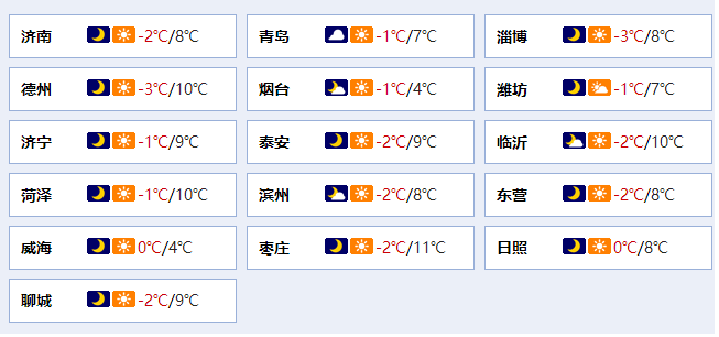 最低气温:鲁中山区-5℃左右,鲁南地区-1℃左右,其他地区-3℃左右。