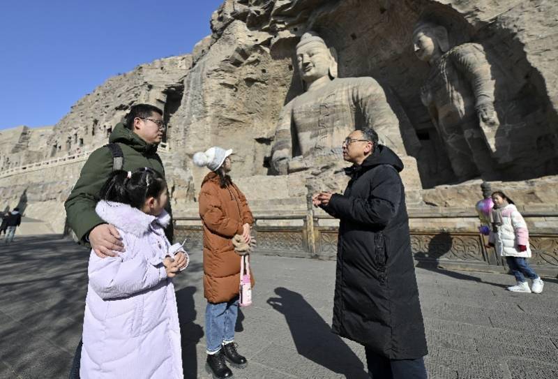 2月25日,杭侃(右二)在云冈石窟调研走访,了解游客的需求。新华社发