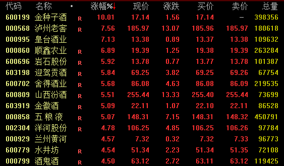 酒类股今日大幅拉升,截至收盘,金种子酒涨停,泸州老窖涨7.56%,舍得酒业、山西汾酒、五粮液等涨超5%,贵州茅台涨约3%重返1700元上方。