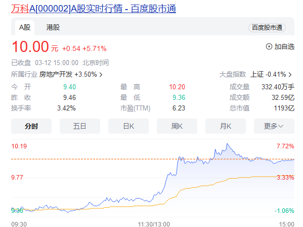 值得注意的是,万科A午后大幅拉升,盘中一度涨近8%。截至收盘,该股涨5.7%报10元,全日成交32.6亿元。港股万科企业亦走强,收盘涨超10%。