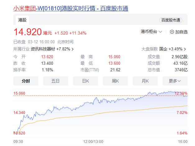 受此消息提振,小米集团今日大幅拉升,盘中一度涨超12%。截至收盘,该股涨11.34%报14.92港元,最新市值3746亿港元。
