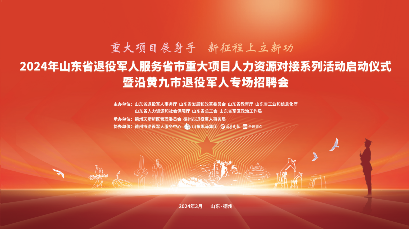 3月15日,2024年山东省退役军人服务省市重大项目人力资源对接系列活动启动仪式暨省内沿黄九市退役军人专场招聘会在德州举行。