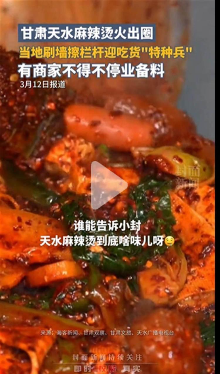 据天水市文旅局网站3月4日的一篇文章介绍,一碗麻辣烫带火了一座城,全国麻辣烫看甘肃,甘肃麻辣烫看天水,在过去的一段时间,“甘肃天水麻辣烫”频频在各大社交平台登上热搜榜,累计播放量达8亿,被大家刷屏点赞并喊话“建议全国推广”,可以说是完完全全的爆火出圈。