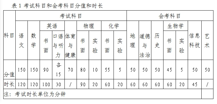初中学业水平考试设置考试科目、会考科目和考查科目三类。考试科目为语文(含书写卷面分5分,采用扣分制)、数学、英语(含口语与听力)、物理(含实验操作)、化学(含实验操作)、体育与健康。会考科目为历史、地理、生物学(含实验操作)、信息科技、道德与法治、艺术(音乐、美术)。考查科目为综合实践活动、劳动、地方课程和学校课程。