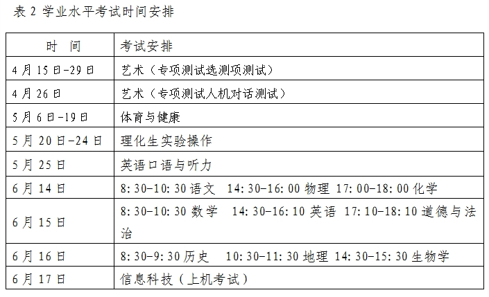 初中学业水平考试科目及时间安排如下(表1、表2)。