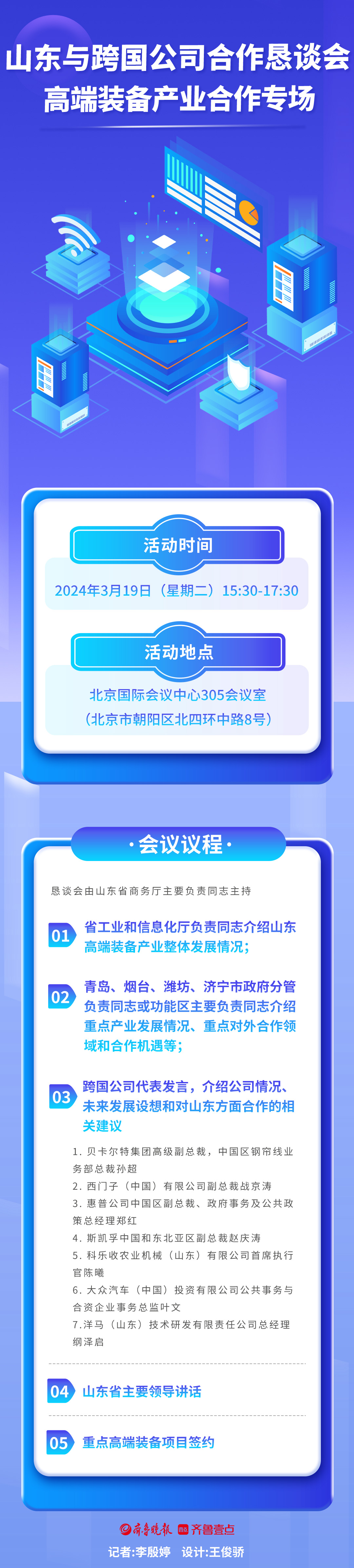 一图读懂丨山东与跨国公司合作恳谈会高端装备产业合作专场 大众报业·齐鲁壹点 2024-03-19 36.5万 记者 李殷婷 王世宇 山东与跨国公司合作恳谈会 “高端装备产业合作专场”于今日在北京国际会议中心举行。 来自比利时、德国、美国等国家和地区的跨国公司负责人齐聚一堂,共话合作新机遇,共图发展新图景。 责任编辑:李殷婷