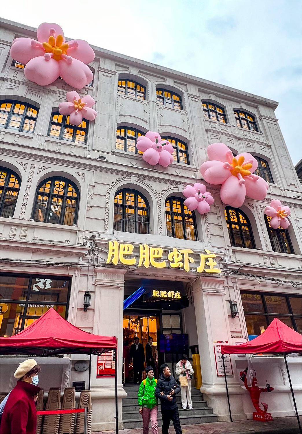 2024年3月18日,在武汉市汉口历史风貌区,多个老建筑上用粉色花朵装饰一新。(湖北日报全媒记者 倪娜 摄)
