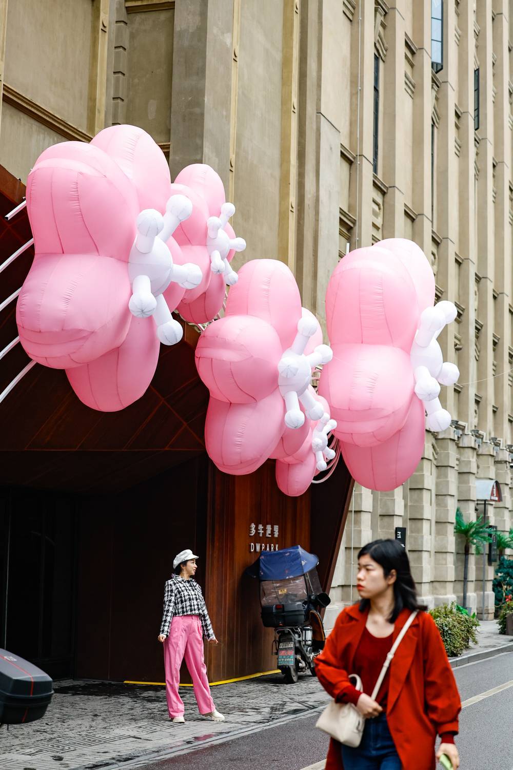 2024年3月18日,在武汉市江汉路步行街上,盛开的粉色花朵悄然“爬上”建筑外立面上,还有限定的樱花市集。(湖北日报全媒记者 倪娜 摄)