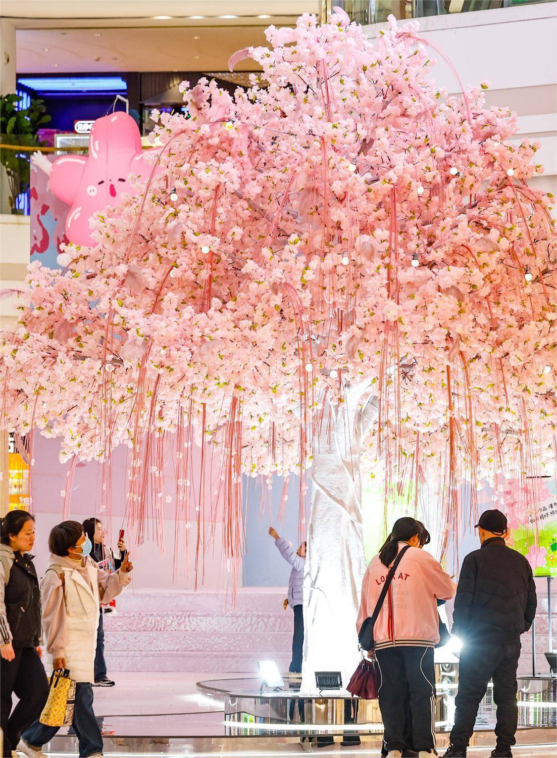 2024年3月18日,在武汉市汉阳摩尔城内,粉色樱花装饰的造景和各种樱花元素,商场各处满满的春日氛围感。(湖北日报全媒记者 倪娜 摄)