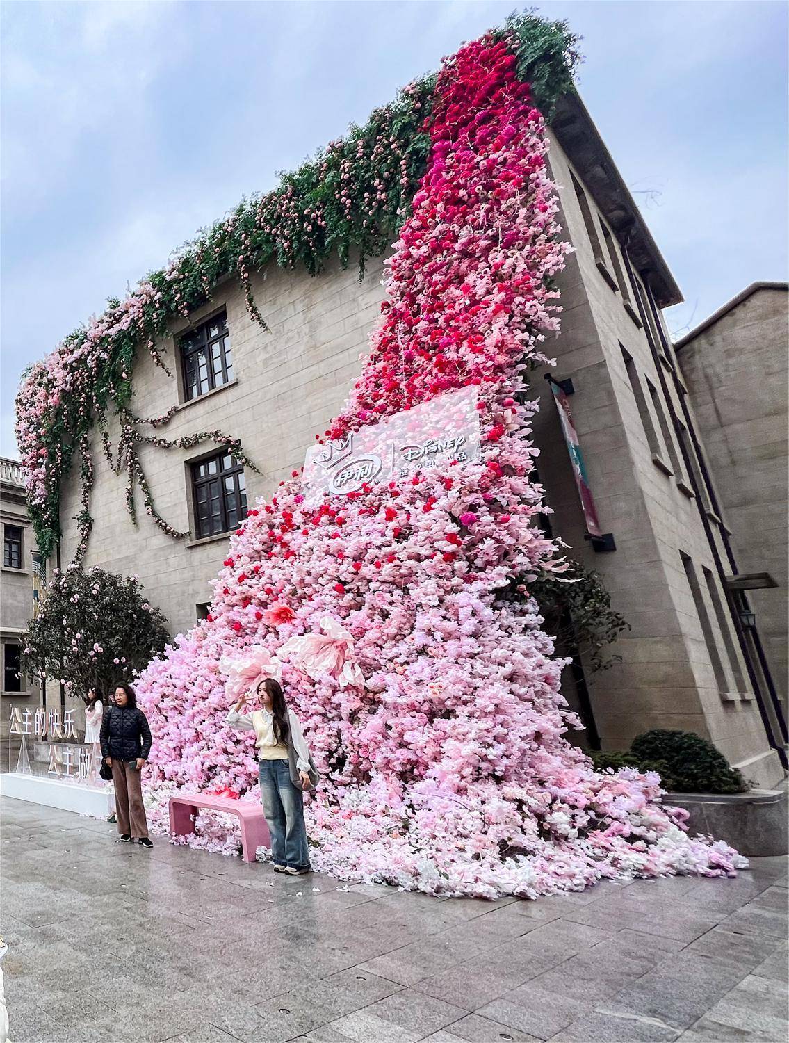 巴公房子、民众乐园等一众建筑物上,“长”出硕大的粉色樱花,引来众多市民打卡拍照。