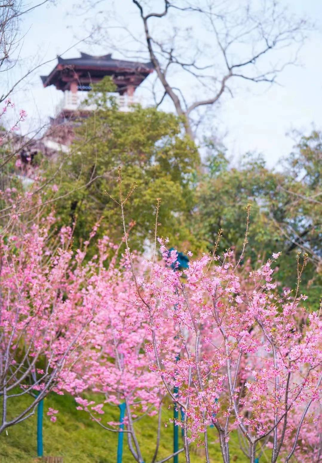 龟山百余株樱花树已进入盛放期。(湖北日报全媒记者 朱惠 通讯员 刘虎成 汤敏 摄)