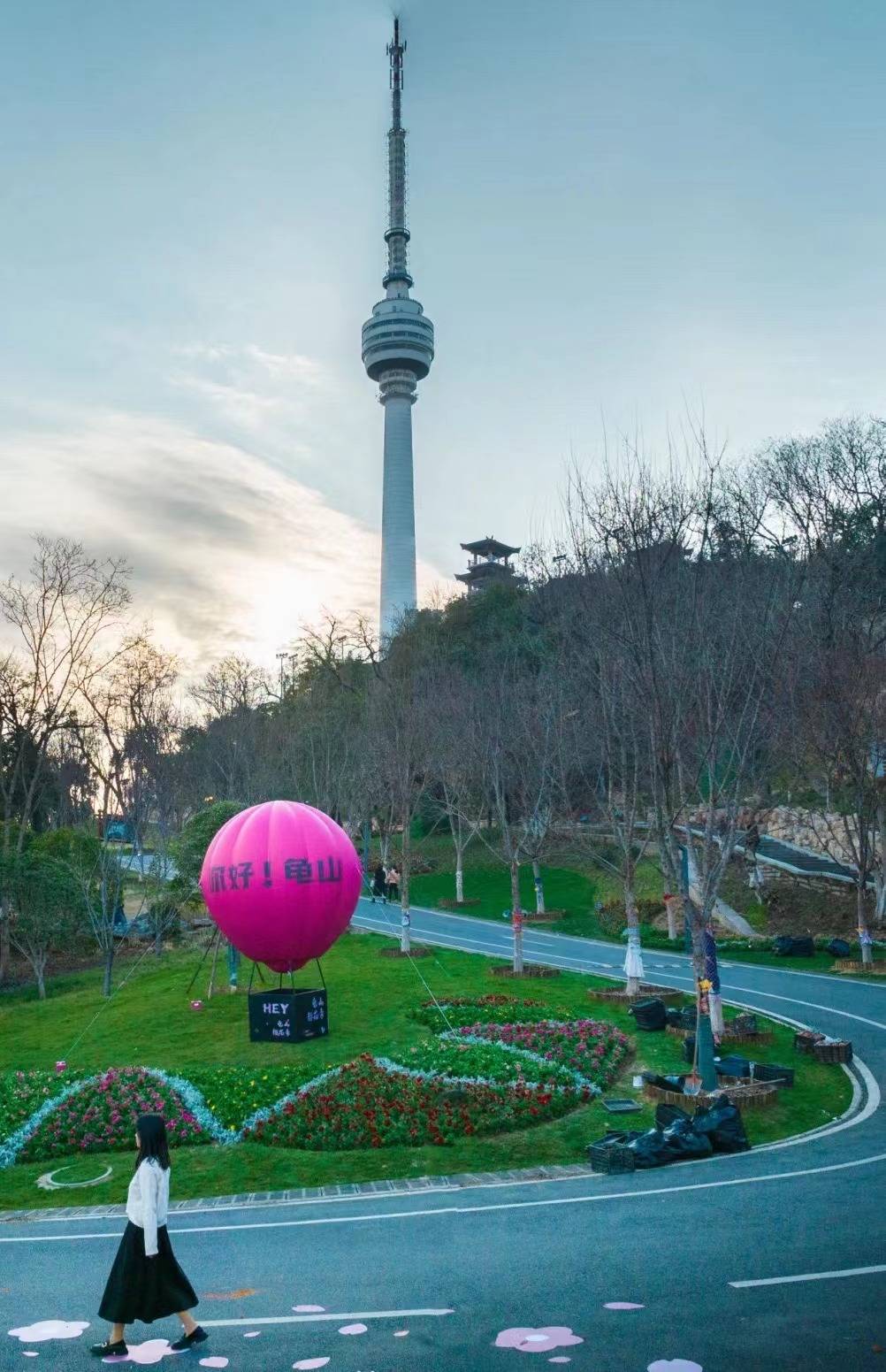 “樱花粉热气球”是龟山打卡点的“人气王”。(湖北日报全媒记者 朱惠 通讯员 刘虎成 汤敏 摄)
