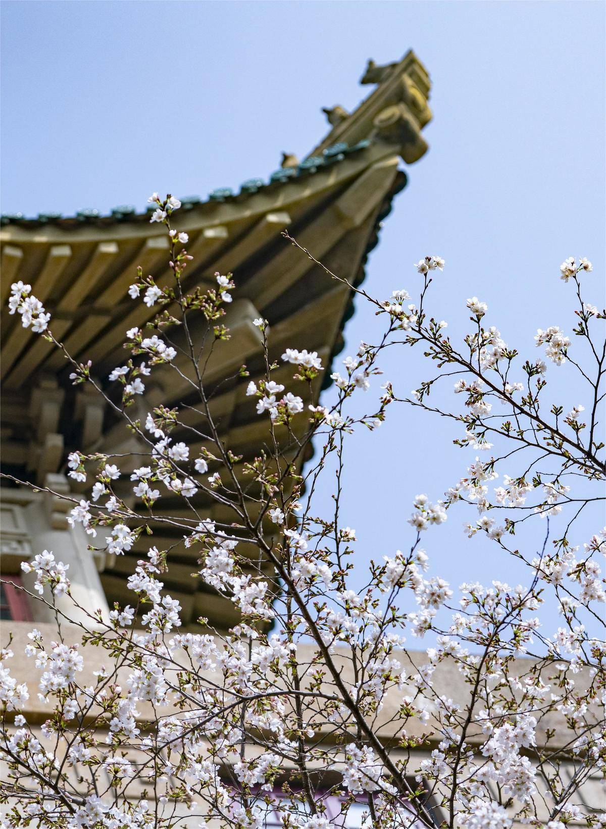 3月19日,武汉市天气晴好,春意盎然,久负盛名武大樱花如约绽放。在武汉大学樱花大道、行政楼、鲲鹏广场附近等樱花集中的区域,已经有不少市民及外地游客赏樱“打卡”。(湖北日报全媒记者 魏铼 摄)