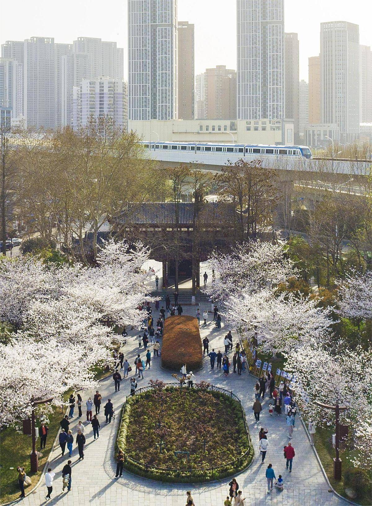 3月19日,春雨初歇,阳光明媚,武汉市江岸区堤角公园樱花迎春绽放,一列列轻轨列车从城市上空飞驰而过,再现樱花与轻轨列车同框的梦幻场景,吸引众多游客、市民前来游玩赏樱,打卡拍照。 (湖北日报全媒记者 任勇 马文俊 摄)