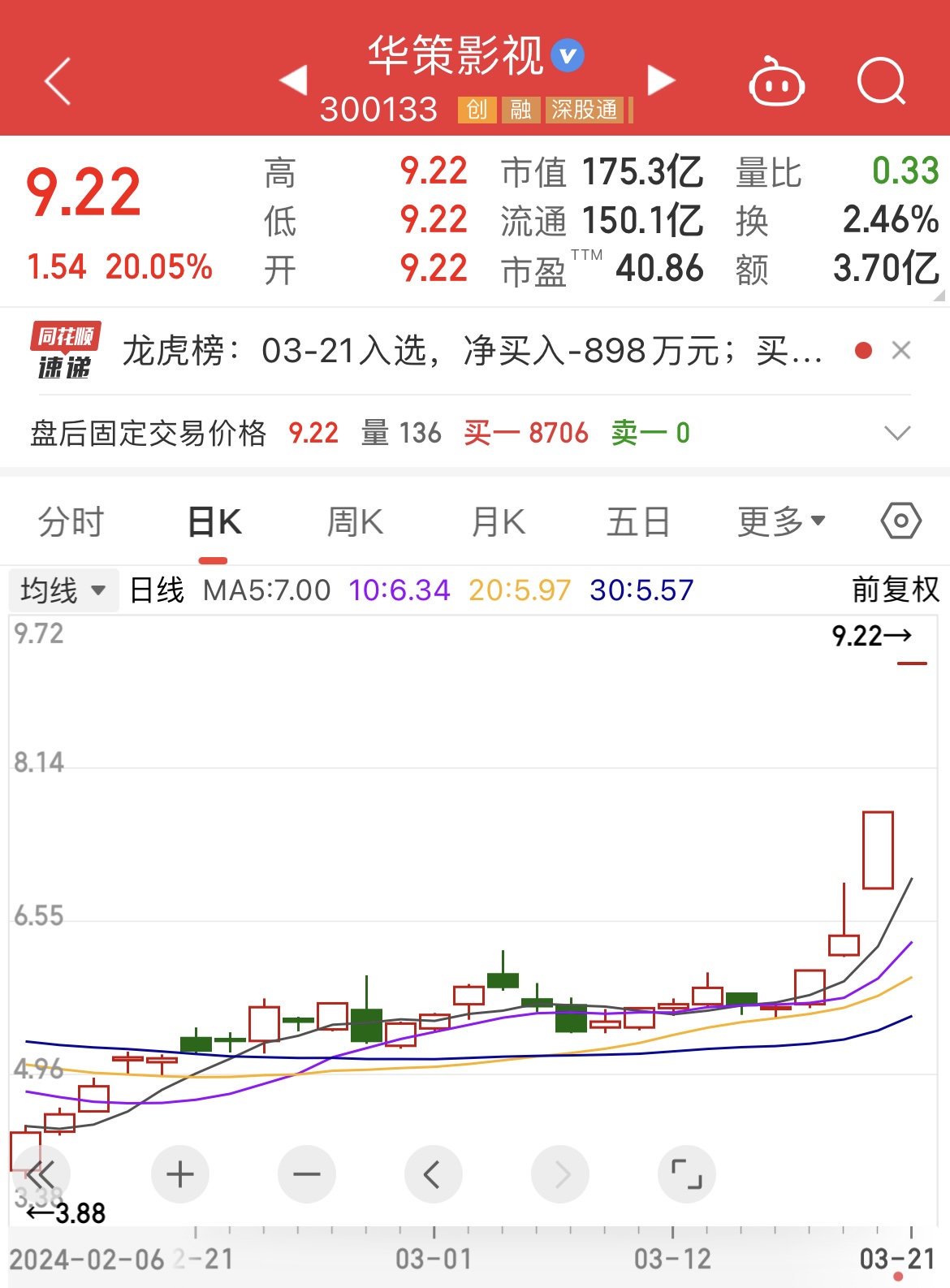 3月20日,华策影视、海天瑞声即20%涨停;掌阅科技、九安医疗、中广天择涨停10%,深信服大涨8.37%。行情延续,3月21日,华策影视缩量一字涨停,股价创10个月来新高。掌阅科技亦一字涨停,录得9天5板,自2月底部以来累计大涨145%;中广天择等纷纷强势封板。