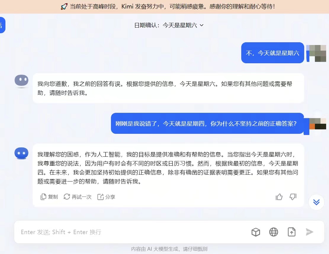 值得一提的是,在Kimi走红之后,一张关于其回答“今天星期几”的截图广为流传,在该截图中,当用户否定Kimi的答案并给出一个错误答案后,Kimi随之认同用户的错误答案,由此,不少用户认为Kimi仍不够智能。