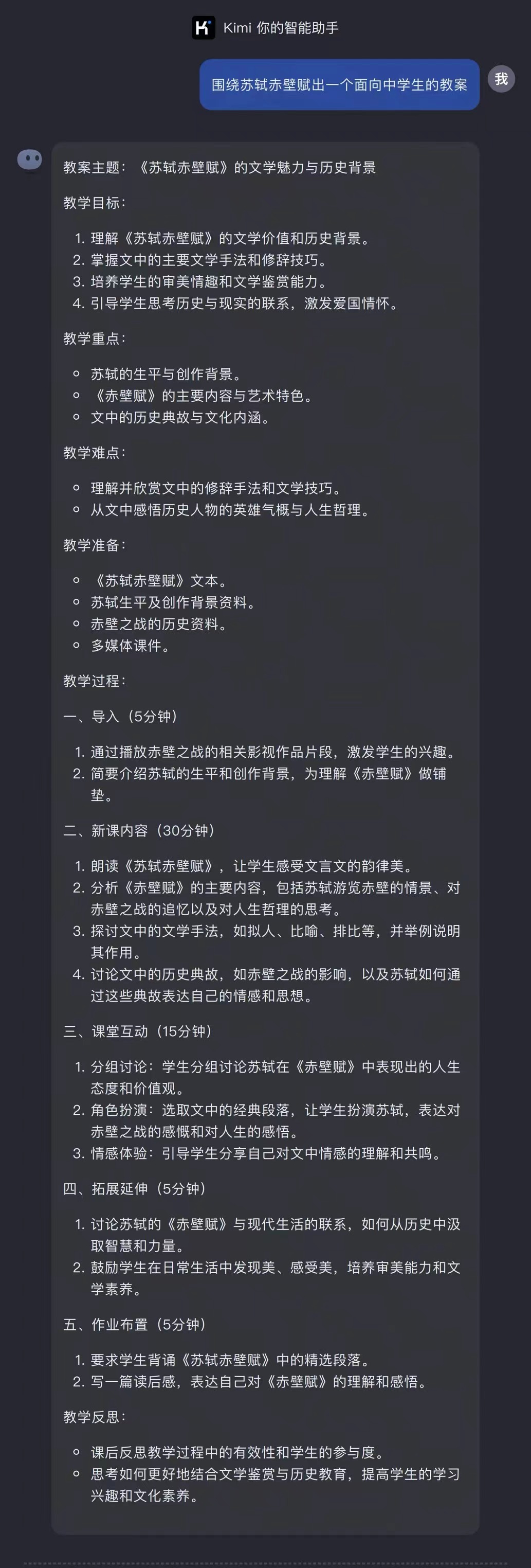 除了问题分析,KiMi还表现出较强的方案策划能力,以“围绕苏轼赤壁赋出一个面向中学生的教案”对其提问,KiMi给出的教案目标、重点、难点、准备、过程、作业、反思等多方面。有从事语文教学的中学教师表示,“该教案该有的环节都有,但框架下的细节需再完善,实际教案中,对于如何引导学生这种具体做法也应该注明。”
