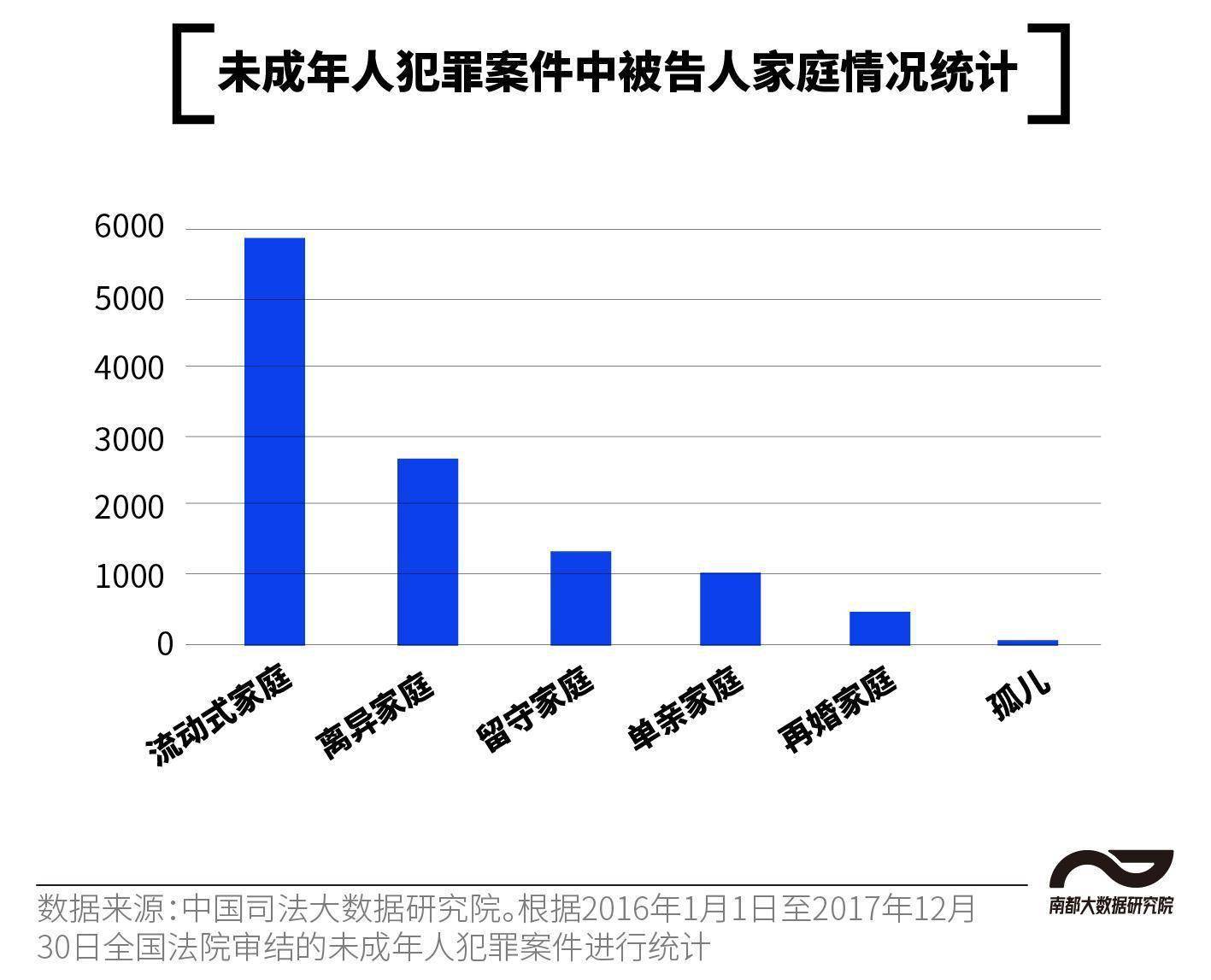 据中国司法大数据研究院数据,2016年1月1日至2017年12月30日全国法院审结的未成年人犯罪案件中,来自流动式家庭、离异家庭、留守家庭、单亲家庭及再婚家庭的未成年人数量分别排名前五。