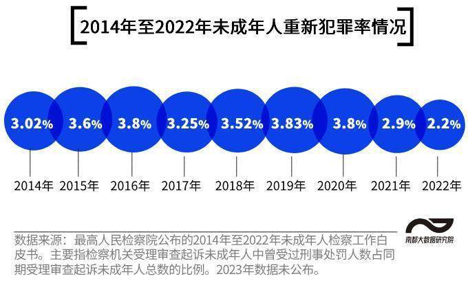 《未成年人检察工作白皮书》数据显示,近年来的未成年人重新犯罪率持续下降,对涉罪未成年人的教育挽救效果进一步提升。2022年,检察机关受理审查起诉未成年人中曾受过刑事处罚的为1737人,占同期受理审查起诉未成年人总数的比例为2.2%,较2014年的3.02%减少了0.88个百分点。
