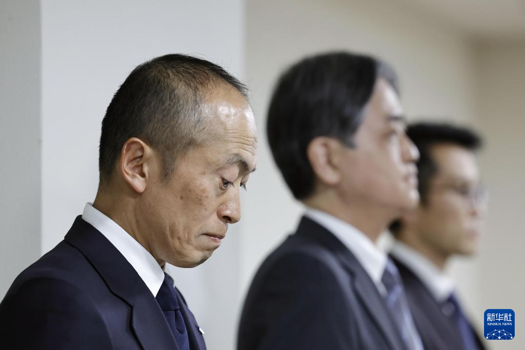 3月22日,在日本大阪,小林制药公司社长小林章浩(左一)在记者见面会上。