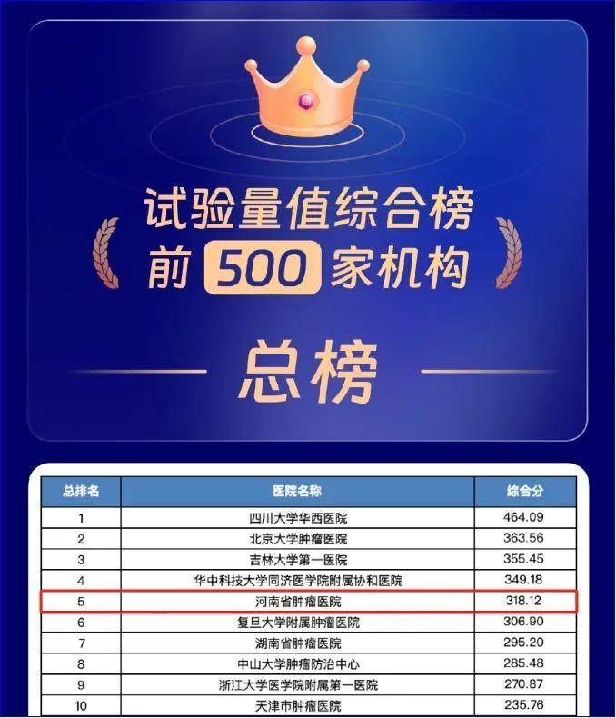 日前,最新版《全国GCP机构药物临床试验量值排行榜》发布。河南省肿瘤医院在2024年度最新榜单中位列全国医院总榜第五位、全国肿瘤医院榜第二位、河南省第一位。