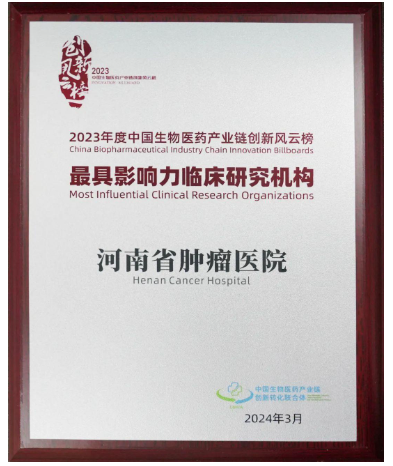 在2024北京经开区协同医药医学创新促进中心(CMAC)年会盛大开幕之时,2023年度“中国生物医药产业链创新风云榜”重磅发布。河南省肿瘤医院药物临床试验机构获得“最具影响力临床研究机构奖”。