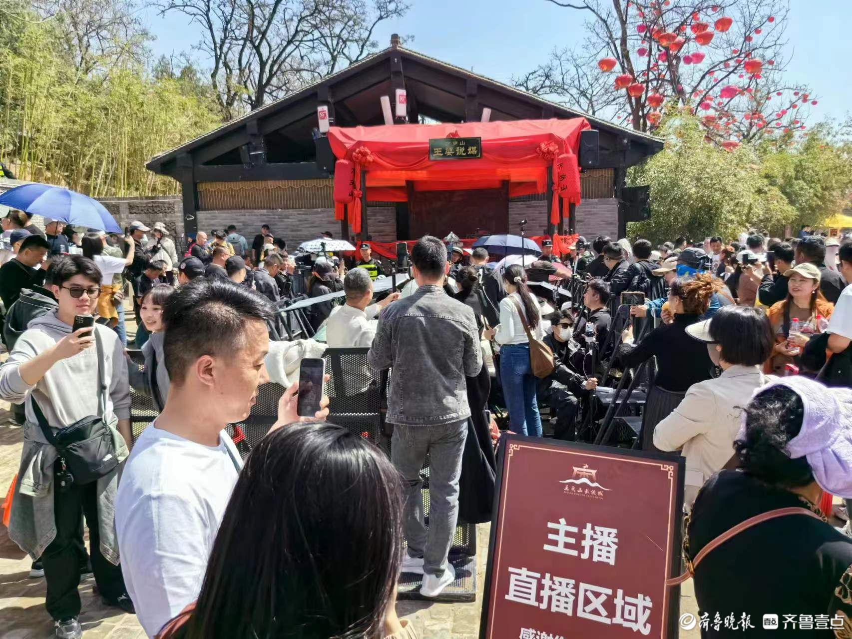 “这乌泱乌泱的人啊,得踮着脚看,不然眼前全是自拍杆……”在等待“王婆说媒”开场前,一位挤在人群中的游客被前来打卡的“直播大军”震撼到。现场,记者看到在王婆舞台的正前方,景区还专门用挡板开辟出了一块“主播直播区”,但隔出来的区域远远无法满足不断涌入的“直播大军”,石阶上、屋檐下、高台前……“王婆说媒”的舞台周围“长”满了手机自拍杆。