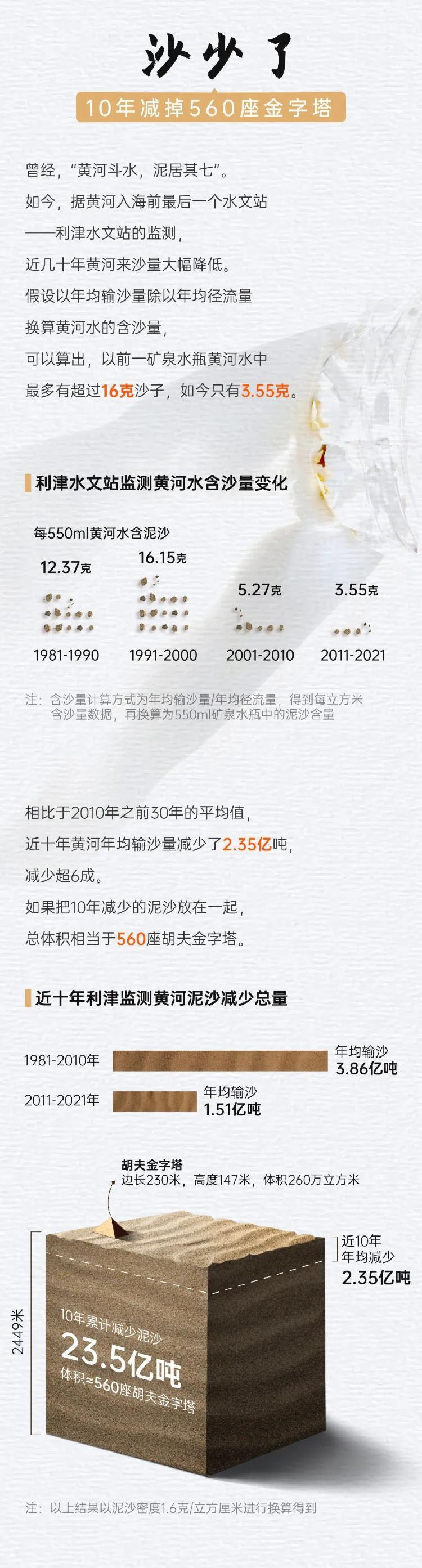 据黄河入海前最后一个水文站——利津水文站的监测,近几十年,黄河来沙量大幅降低。1981-2010年,黄河年均输沙3.86亿吨,2011-2021年,年均输沙1.51亿吨。相比于2010年之前30年的平均值,近十年黄河年均输沙量减少了2.35亿吨,减少超6成。以前一矿泉水瓶黄河水中,最多有超过16克沙子,如今只有3.55克。