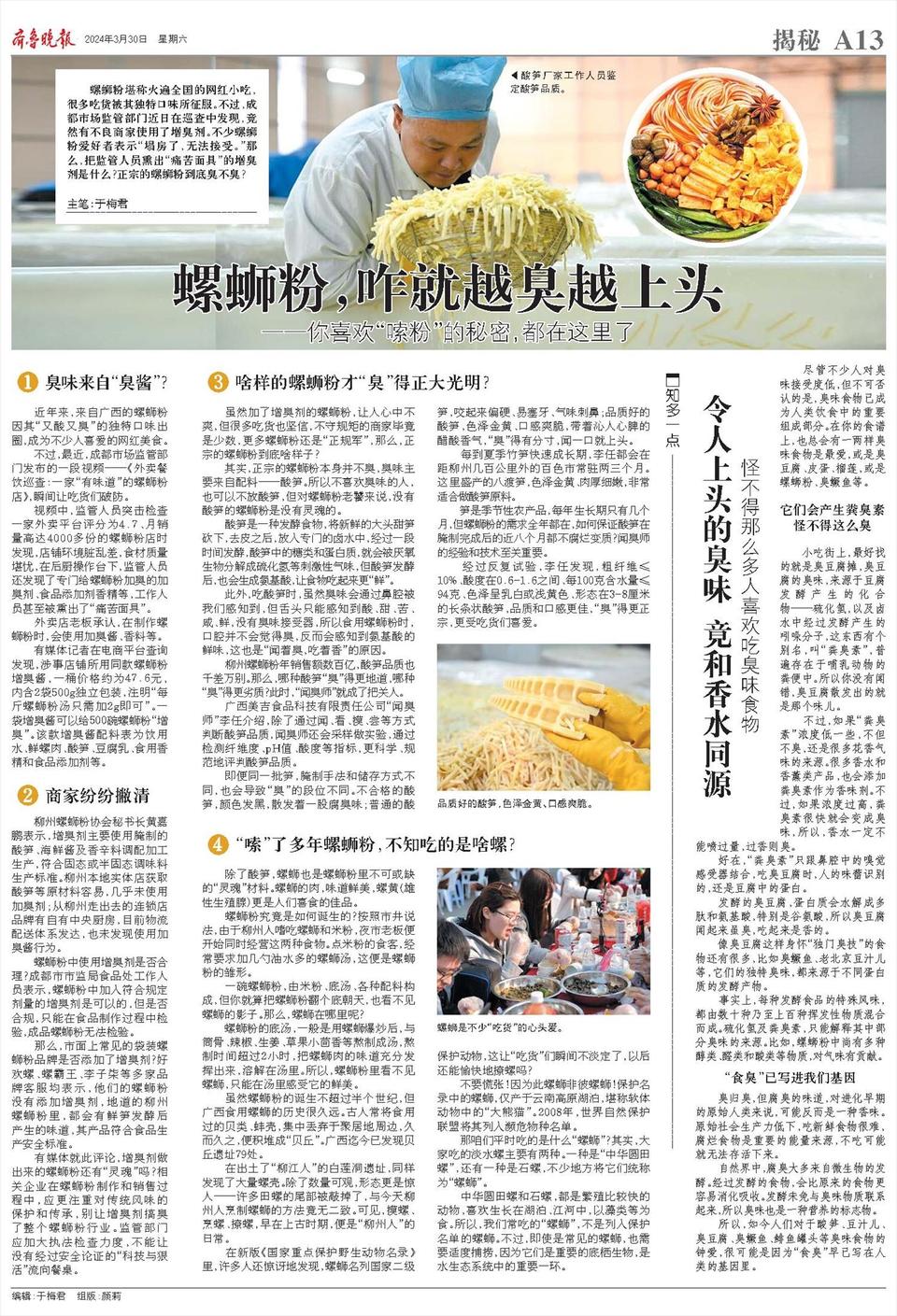 有媒体就此评论,增臭剂做出来的螺蛳粉还有“灵魂”吗?相关企业在螺蛳粉制作和销售过程中,应更注重对传统风味的保护和传承,别让增臭剂搞臭了整个螺蛳粉行业。监管部门应加大执法检查力度,不能让没有经过安全论证的“科技与狠活”流向餐桌。