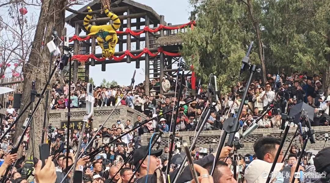 “这乌泱乌泱的人啊,得踮着脚看,不然眼前全是自拍杆……”在等待王婆说媒开场前,一位挤在人群中的游客被前来打卡的“直播大军”震撼到。现场,记者看到在王婆舞台的正前方,景区还专门用挡板开辟出了一块“主播直播区”,但隔出来的区域远远无法满足不断涌入的“直播大军”,石阶上、屋檐下、高台前……王婆说媒的舞台周围“长”满了手机自拍杆。