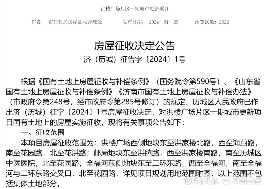 在历城区住房城乡建设局2014年1月29日发布的房屋征收决定公告中显示,洪楼广场西侧地块的征收范围为东至洪家楼北路,西至海蔚路,南至花园路,北至花洪路。济南市民习惯称为“洪楼大润发”的大润发历城店正处于该地块当中。