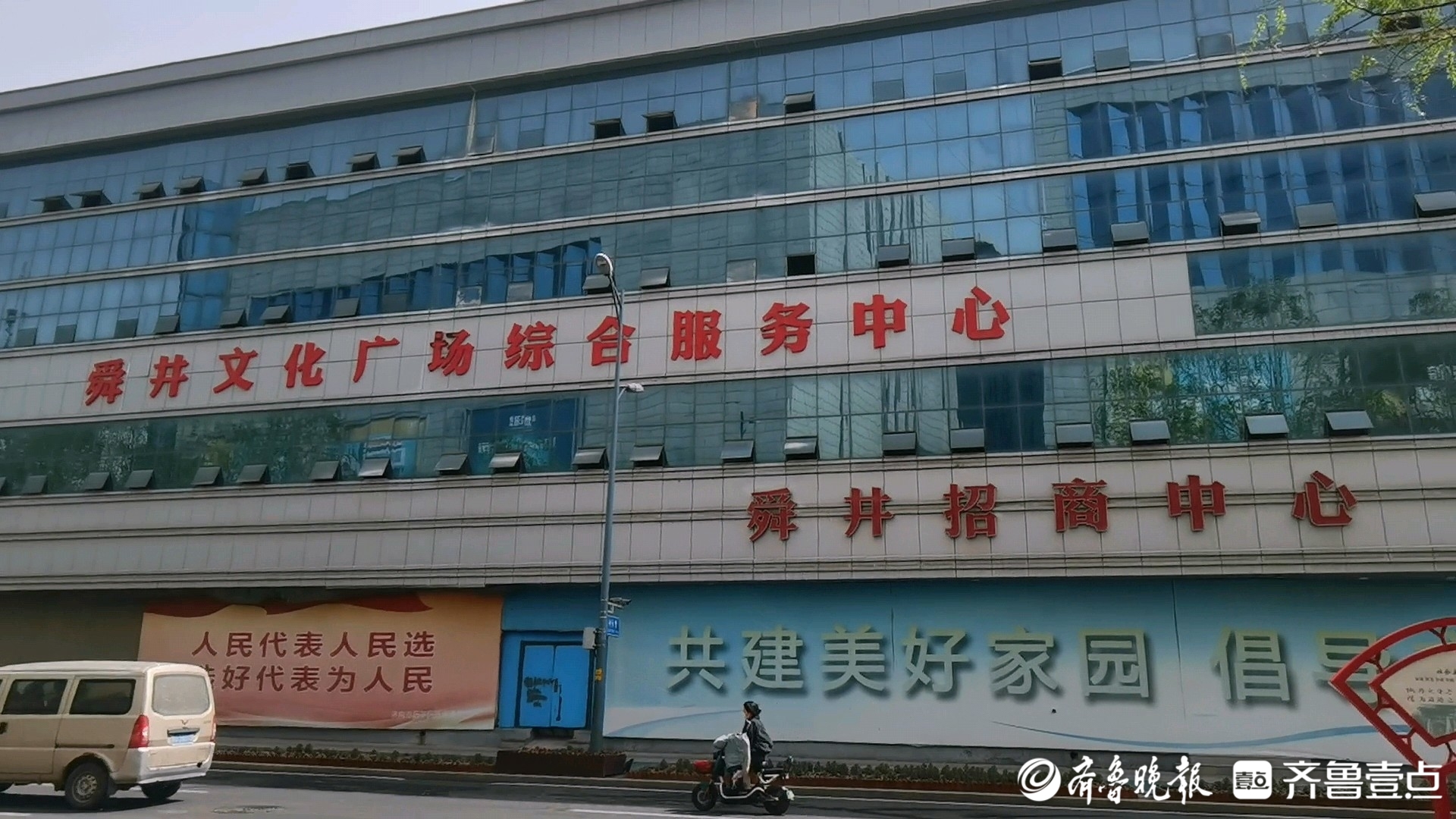 与舜井商厦隔舜井路“相望”,一建筑西侧外墙上贴有“舜井文化广场综合服务中心”“舜井招商中心”的红色大字,前者也正是该建筑在“高德地图”软件上对应的名称。