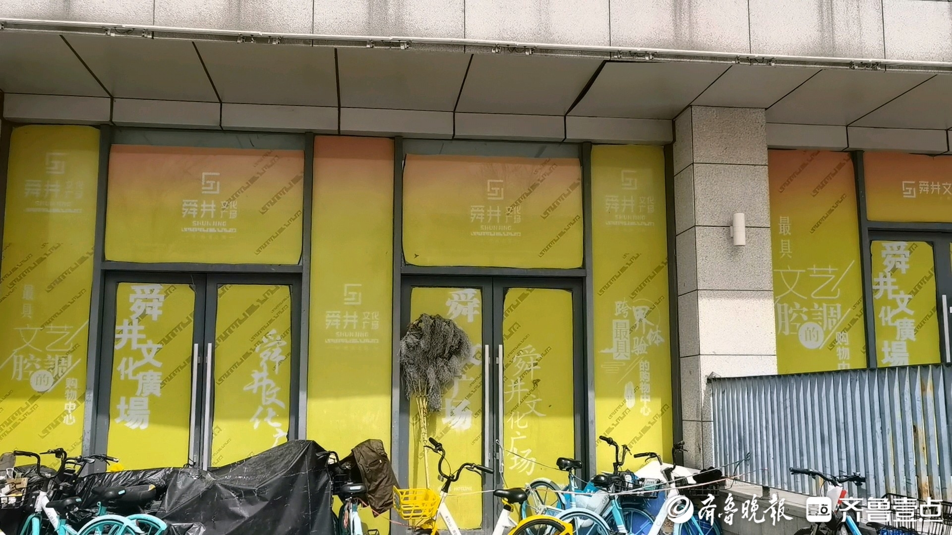 绕建筑一周,记者并没有找到能进入楼内的入口。一楼底商无人营业,有些玻璃门外侧被写着“舜井文化广场”字样的橙黄色贴纸完全覆盖,无法看到内部;有些门玻璃裸露,向内看,只见光秃秃的承重墙,四周空无一物。