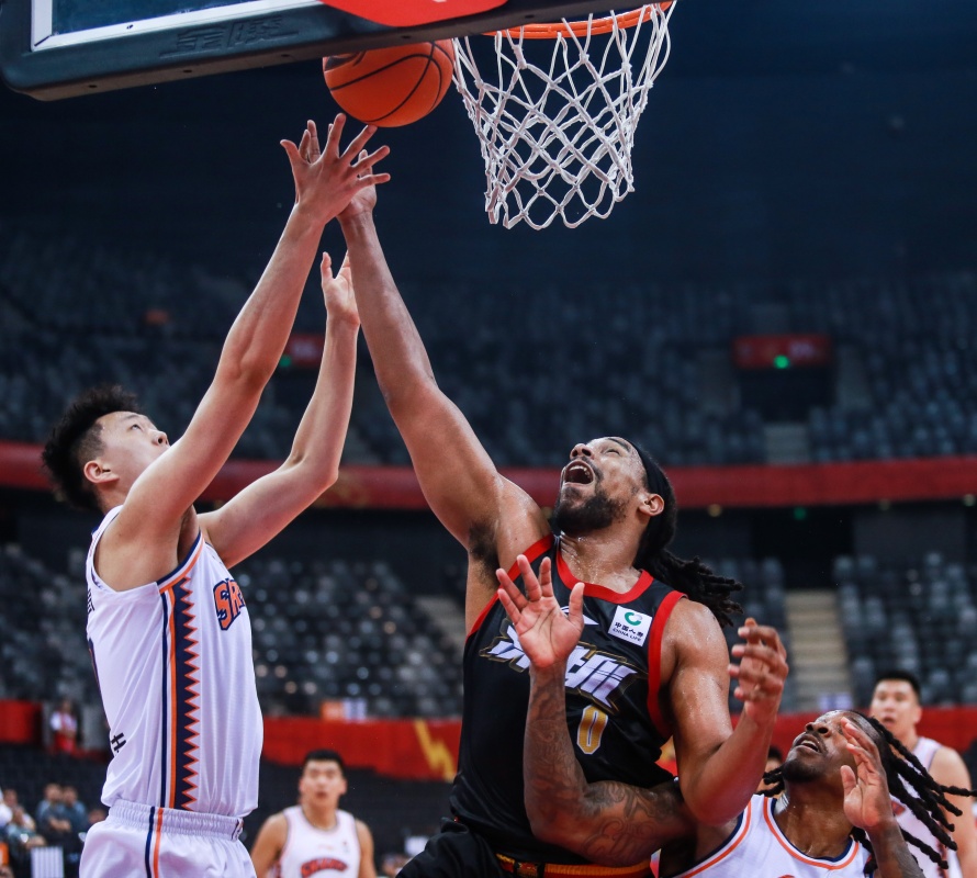 4月1日,深圳马可波罗队球员萨林杰(中)在比赛中上篮。新华社