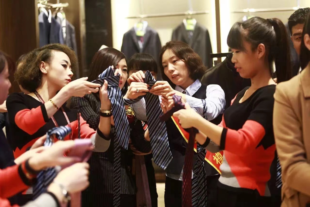 在这次技能大赛上获奖的于真真是速打领带的吉尼斯世界纪录保持者。“最初我发现客户在购买西装时对领带的需求也很高,有时会让我们打好一起带走,我就开始研究领带,发现真是大有学问。”于真真先是学习领带的材质、内衬、工艺、图案等等,后来又发现单了解领带也不行,还要根据穿着场景的不同进行选择。至于扎系方法更是别有洞天,简易结口、四手结、浪漫结、温莎结、半温莎结……她先从保证扎系美观、规范入手,慢慢地追求速度上的突破和扎法上的丰富。