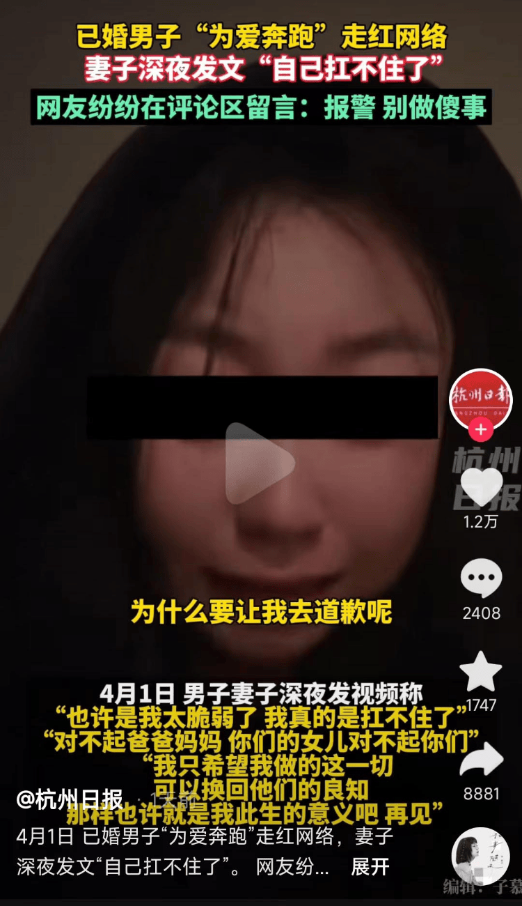 据白鹿视频报道,4月1日,“已婚男上王婆说媒”事件当事女方小薛深夜发视频疑欲轻生,视频中,小薛称:“也许是我太脆弱了,我真的是扛不住了,原本我的人生可以很精彩,现在一切都随风飘走了,是我这些年来没有把你看清楚,是我自己的选择,就应该我自己来承受。对不起爸爸妈妈,你们的女儿对不起你们,我只希望我做的这一切,可以换回他们的良知,那样也许就是我此生的意义吧,再见。”有网友称看到视频后向银川警方报警。