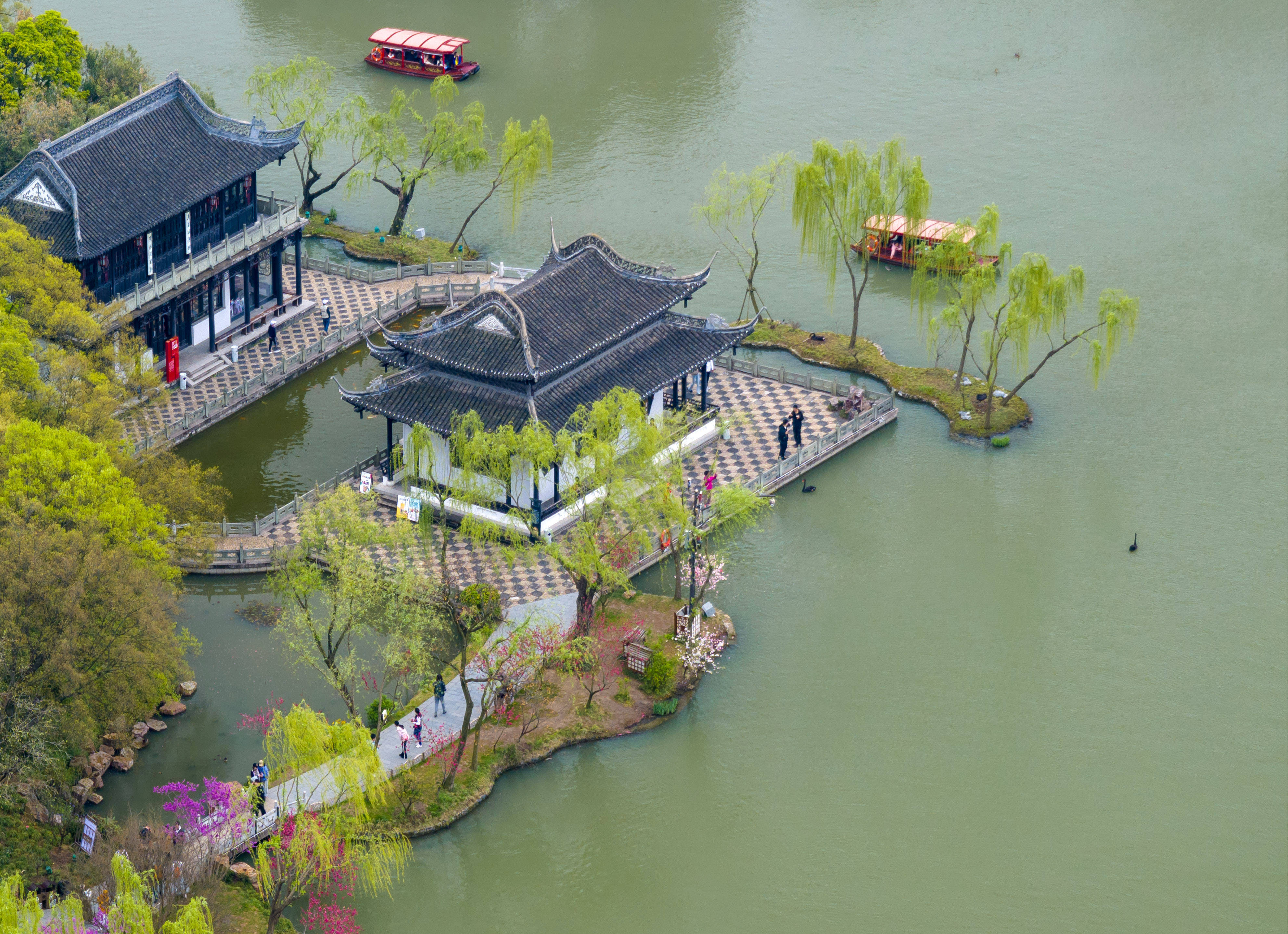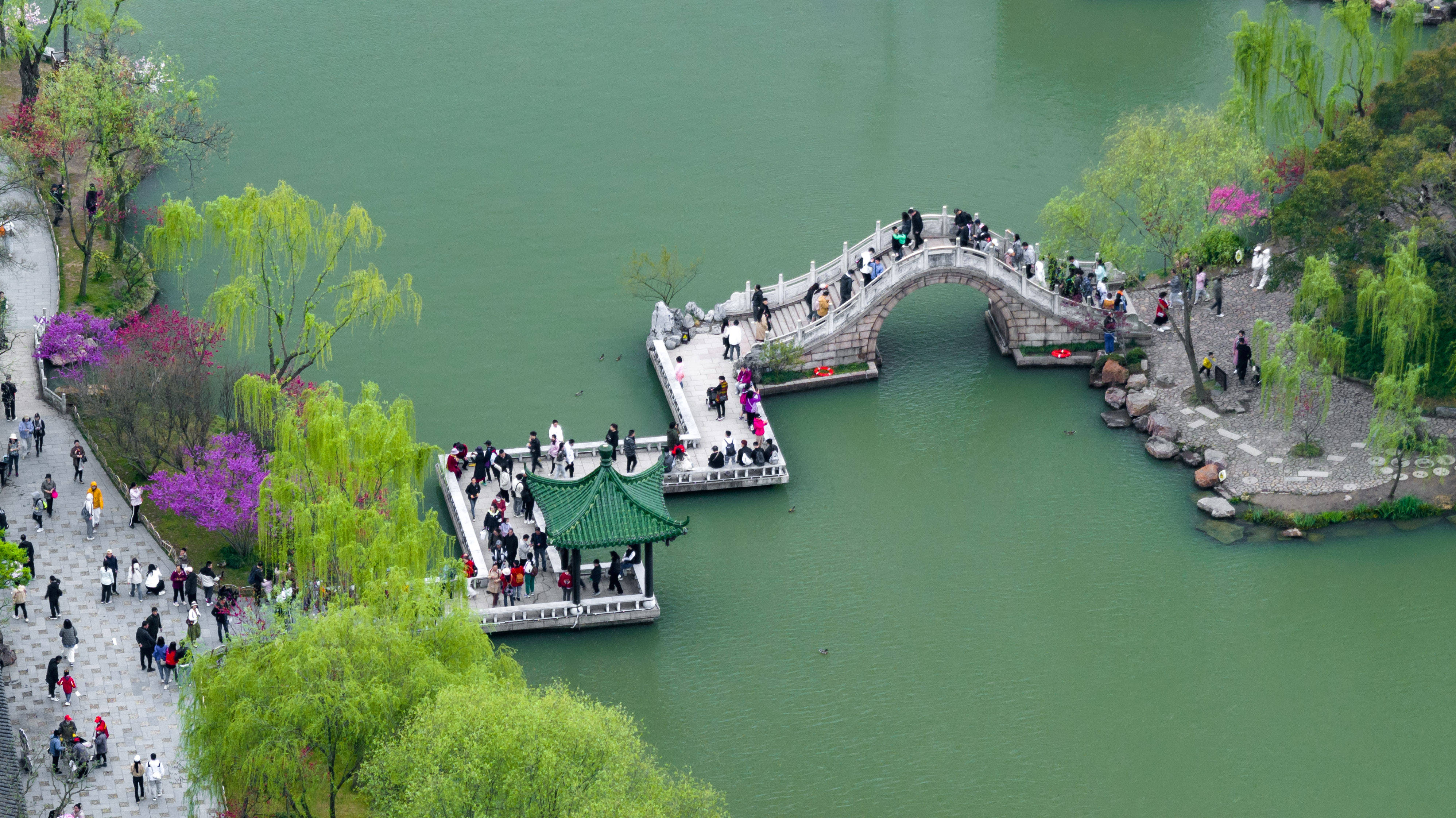 ↑2024年4月3日,游客在江苏省扬州市瘦西湖风景区游览。(无人机照片)CICPHOTO/周社根 摄