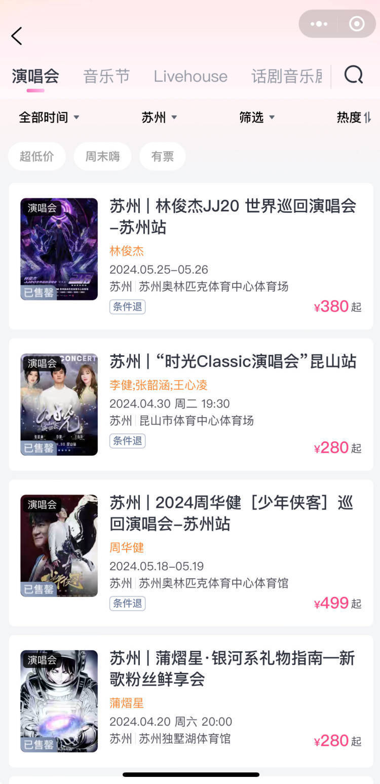 多场热门演唱会门票均已售罄。图片来源/大麦网