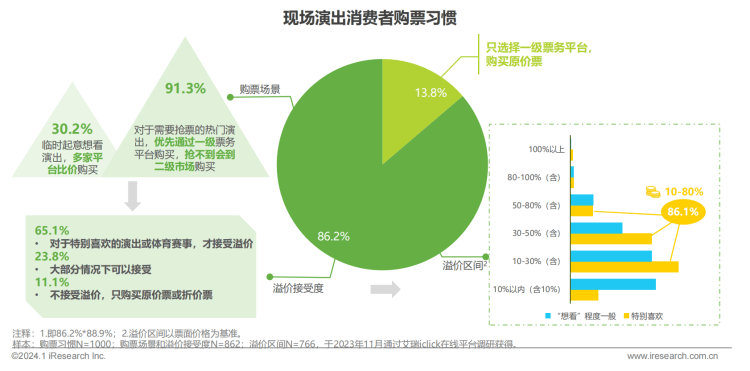 而对于二级市场,消费者认为最大的弊病在于“黄牛”的存在。但二级平台的出现在一定程度上缓解了“黄牛”乱象。《报告》中提到,从购票习惯上来看,仅13.8%的消费者只选择一级票务平台购买原价票,86.2%则会使用二级平台,且87%的消费者认为价格上下波动可以接受。因此,二级平台一定程度上使市场供求达到均衡状态。