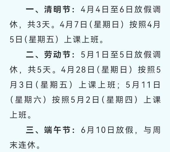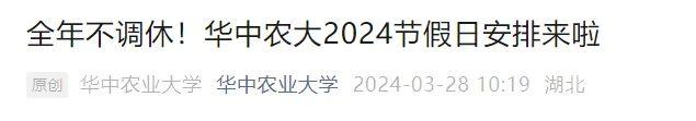 3月28日,华中农业大学发布公告称,结合校历和年度教学计划安排,学校制定了全年部分节假日放假安排,学校全年周末正常休假,不做调课安排。