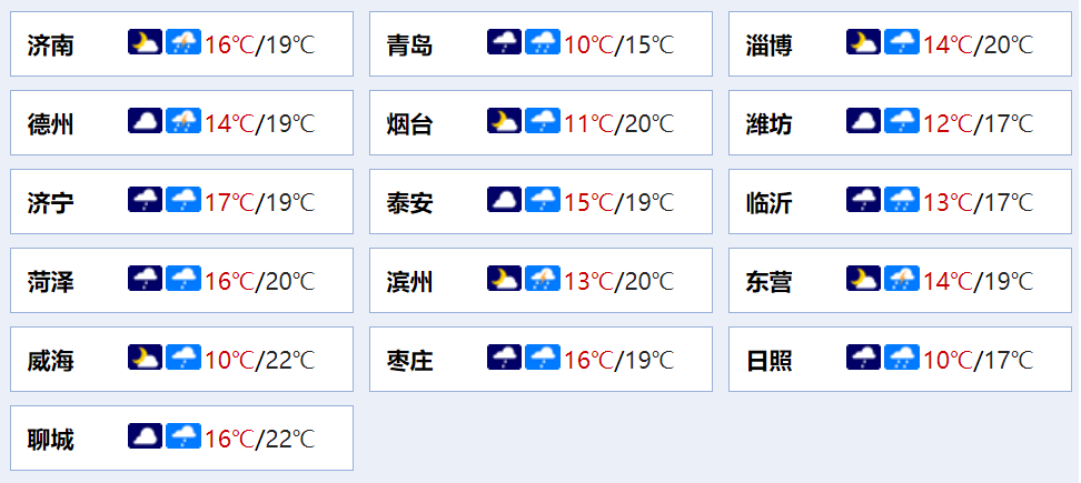 最低气温:日照、潍坊、鲁中山区和半岛地区10℃左右,菏泽和聊城16℃左右,其他地区14℃左右。