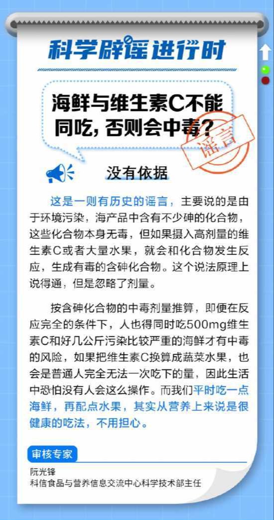 按含砷化合物的中毒剂量推算,即便在反应完全的条件下,人也得同时吃500mg维生素C和好几公斤污染比较严重的海鲜才有中毒的风险。我们平时吃一点海鲜,再配点水果,其实是很健康的吃法,不用担心。