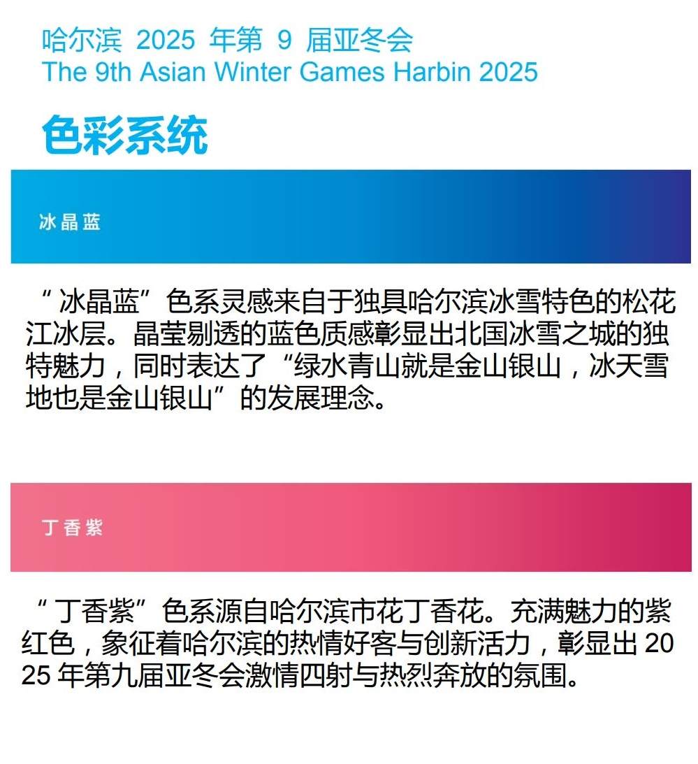 2025年第九届亚冬会的“翠影紫梦”色彩系统包含“冰晶蓝”、“丁香紫”、“兴安绿”、“丰登黄”四大主题色系。色彩系统将主要用于比赛项目体育图标、城市氛围营造、场馆和特许产品开发等的设计工作。