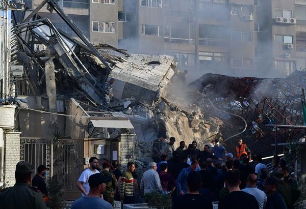 4月1日,在叙利亚首都大马士革,人们聚集在伊朗驻叙使馆领事建筑遭袭现场。(新华社)