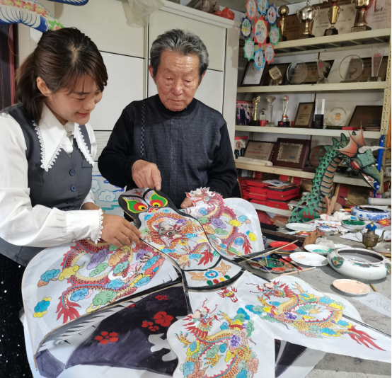 国家级非遗风筝代表性传承人张效东与徒弟王世英。