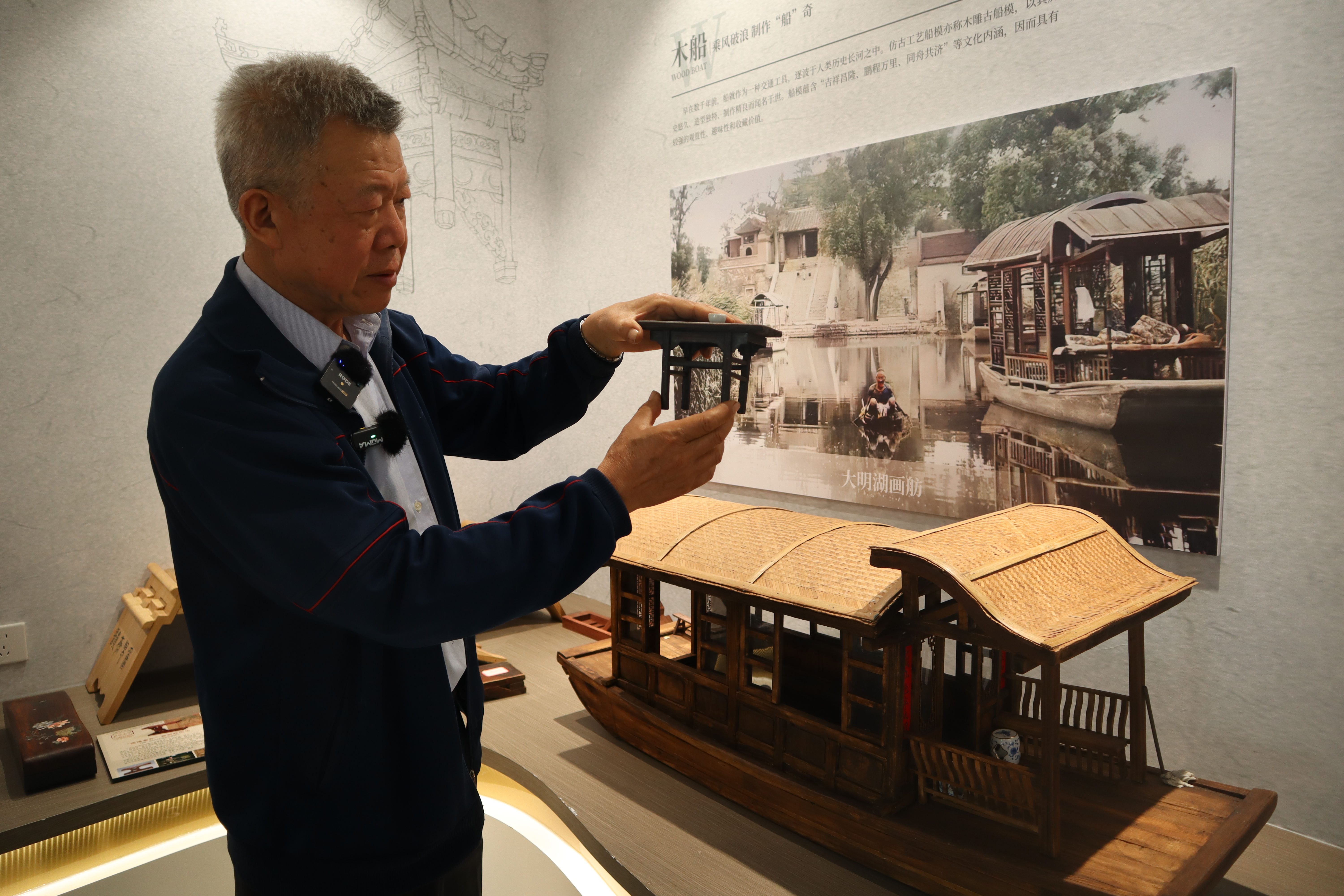 4月18日一早,古船修复匠人尚津济第一次来到全面提升后的百花洲传统工艺工作站。展厅里,摆放着他对照老照片复刻的四艘古船模型。其中一艘游船画舫,是他为百花洲历史文化街区专门打造的“贺礼”。